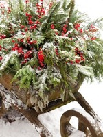 Continue to decorate with greenery, red and gold bows, rosebuds, cloves, and dust with flour.